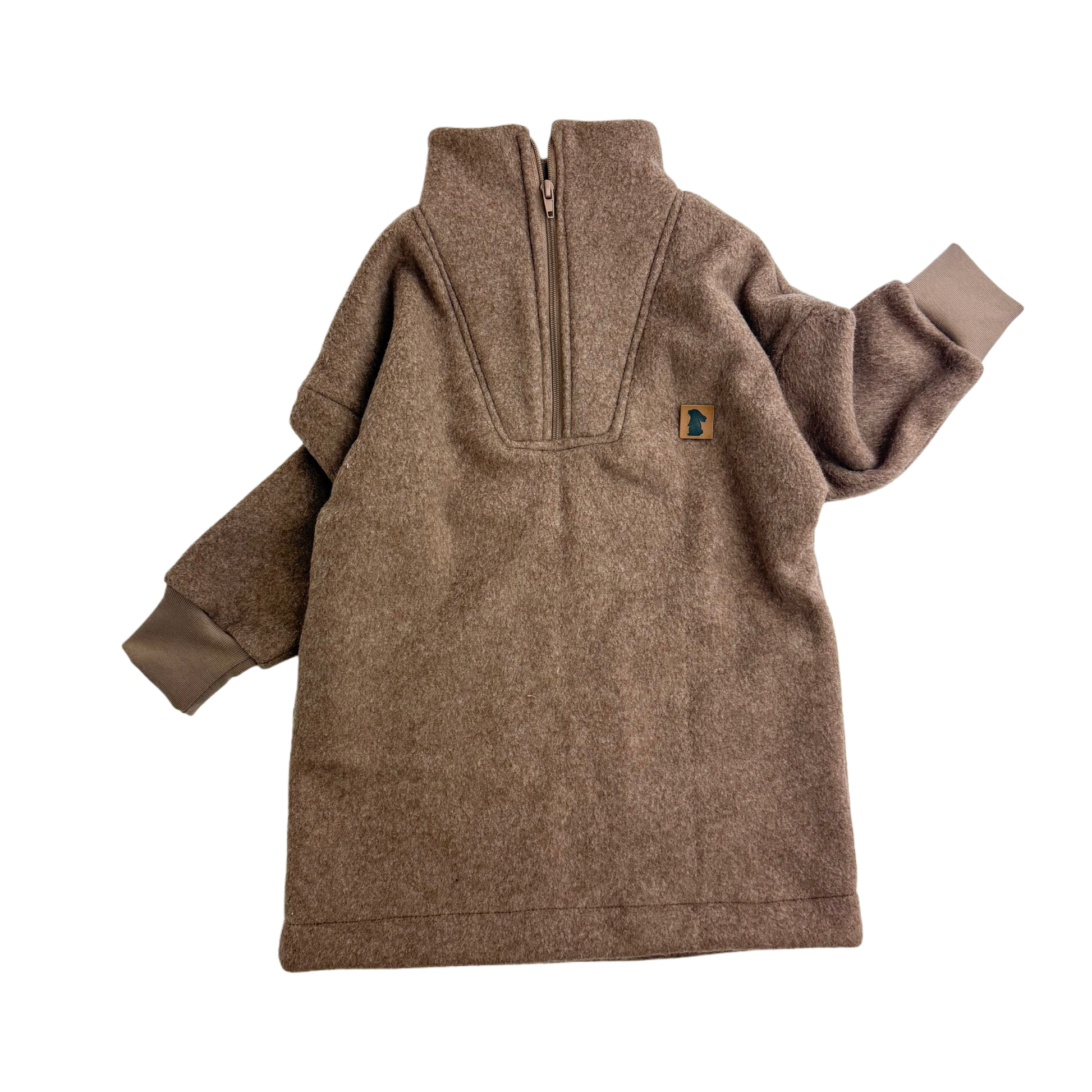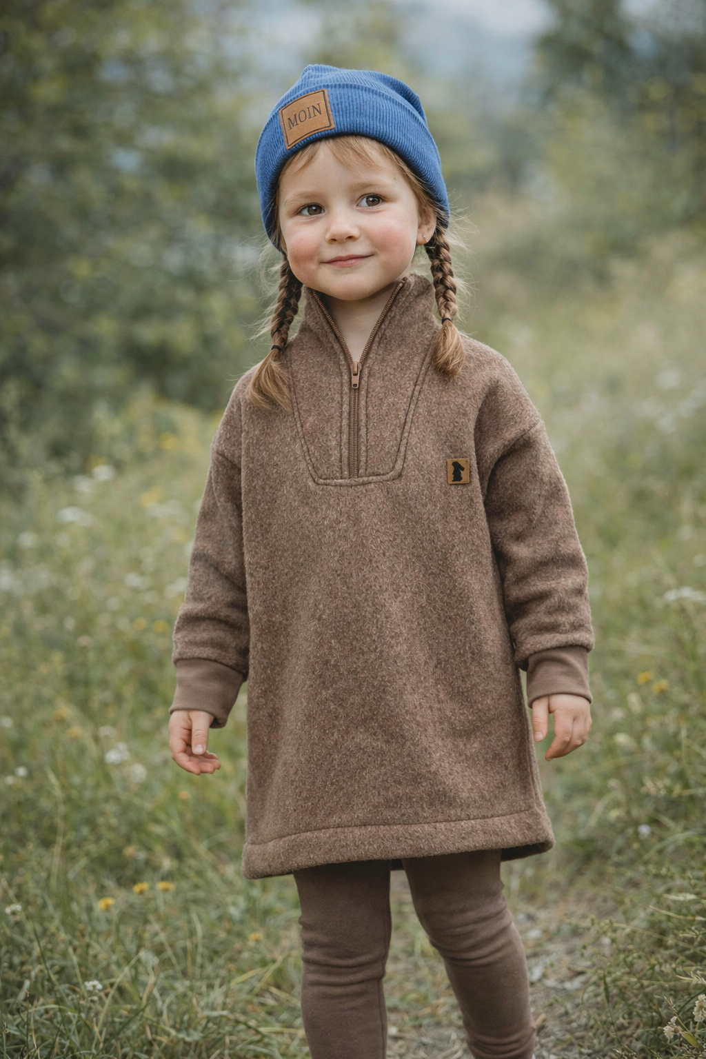 Der Schnitt ist bewusst weit und leicht verlängert, sodass der Troyer unter dem Po sitzt (natürlich hat jedes Kind andere Proportionen). Dadurch wächst er wunderbar mit und bleibt lange tragbar.