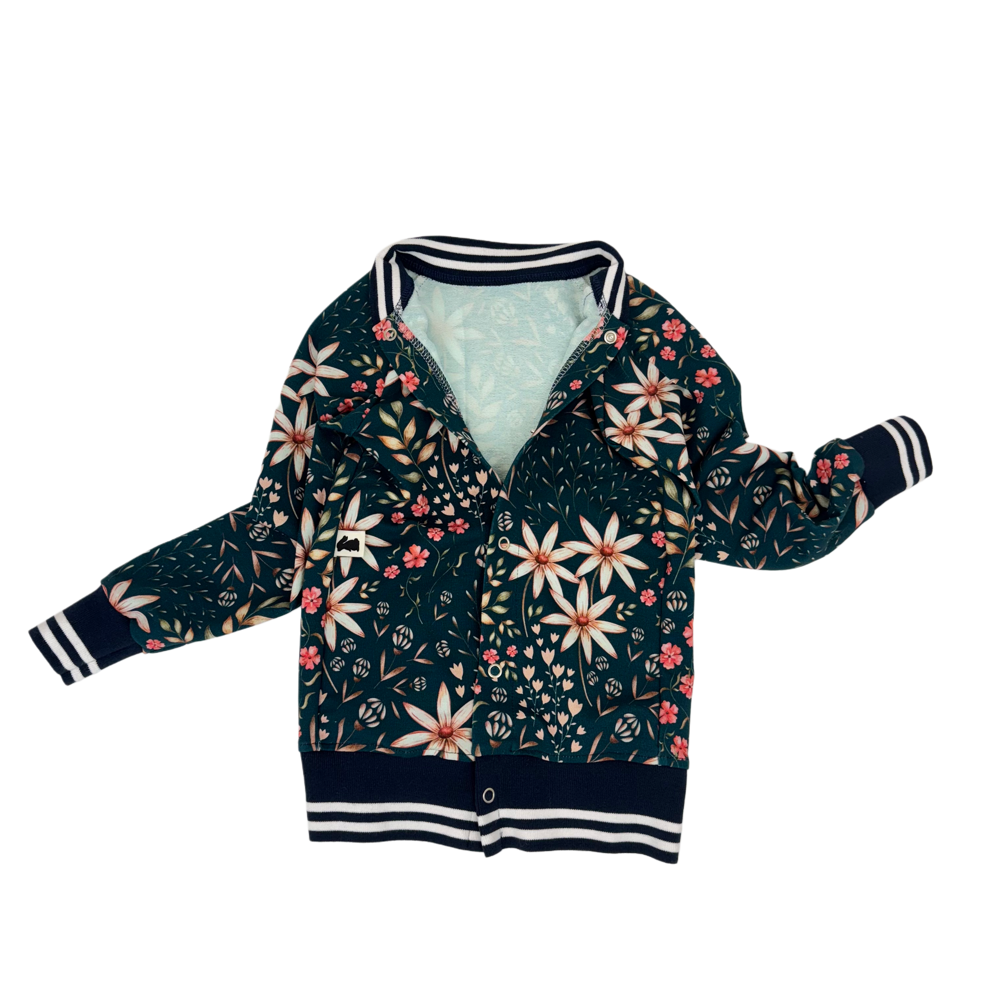 Lässig, modern & sofort verfügbar: unser Cardigan im College-Style aus French Terry „Herbstblume Petrol“. Mit Collegebündchen für den coolen Look – handmade in Gr. 110/116.
