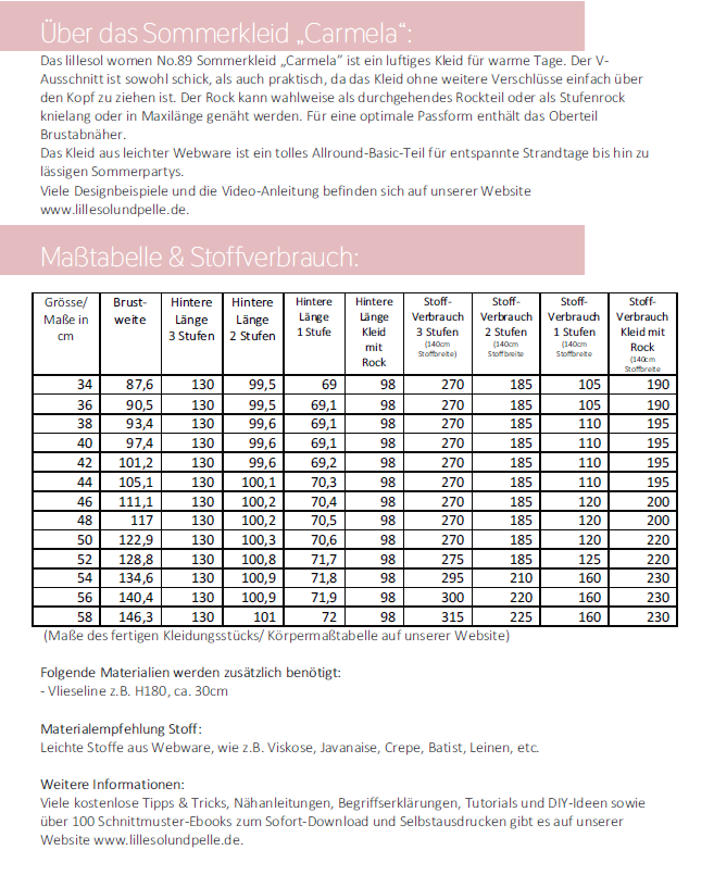 Das lillesol women No.89 Sommerkleid „Carmela” ist ein luftiges Kleid für warme Tage. Der V-Ausschnitt ist sowohl schick, als auch praktisch, da das Kleid ohne weitere Verschlüsse einfach über den Kopf zu ziehen ist. Der Rock kann wahlweise als durchgehendes Rockteil oder als Stufenrock knielang oder in Maxilänge genäht werden. Für eine optimale Passform enthält das Oberteil Brustabnäher.